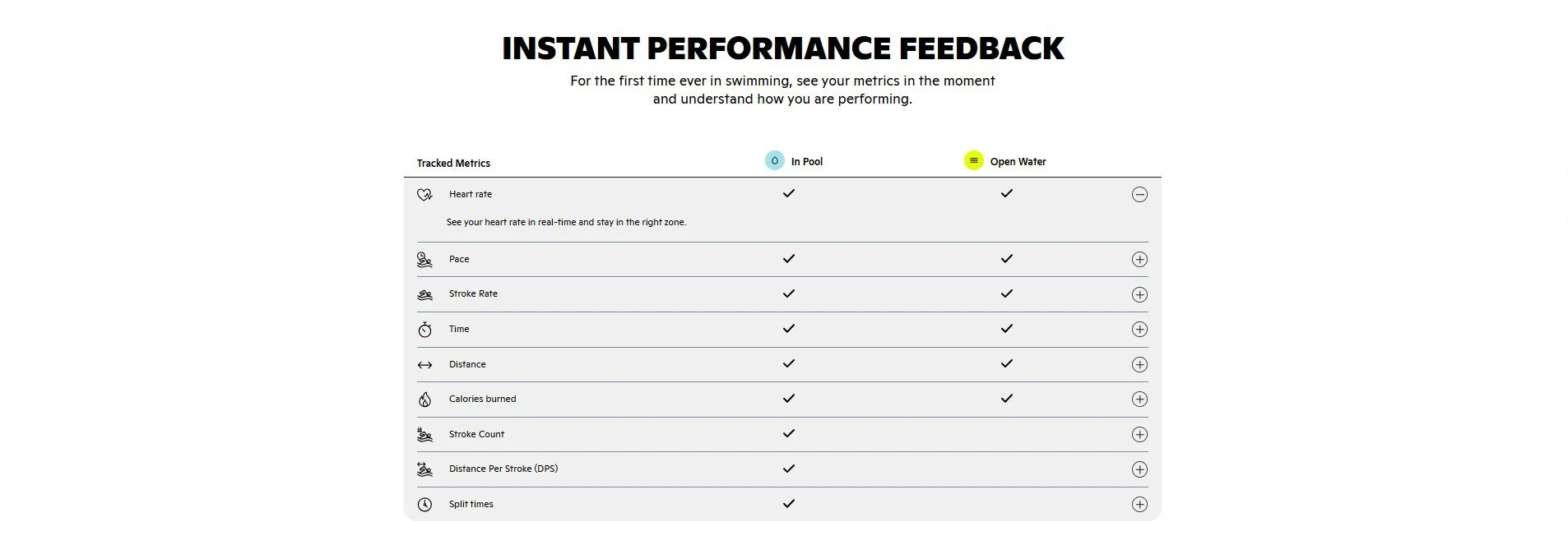 *Open Water Swim Tracking: Captures heart rate, stroke rate, and time using onboard sensors, plus GPS-powered distance and pace when paired with Garmin or Apple watches