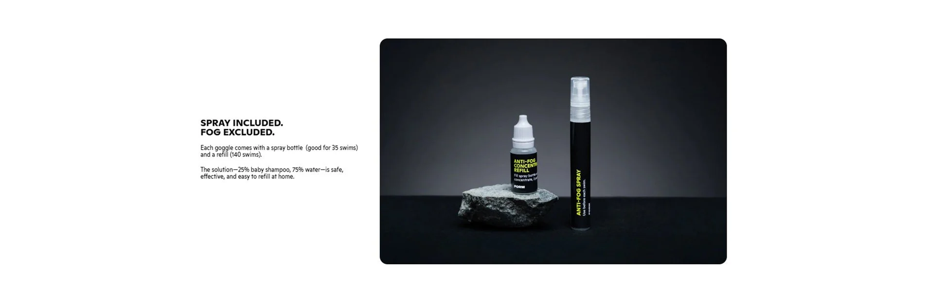 *Anti-fog spray and concentrate included. Good for up to 175 swims. Refill easily with water and baby shampoo. How to apply the spray?